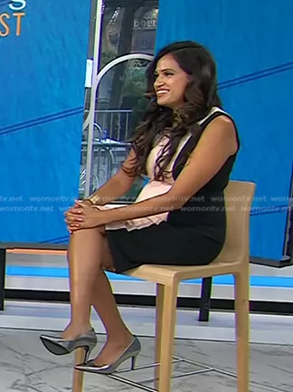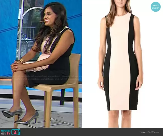 on Today on NBC was spotted wearing this black and pink colorblock dress on Today on Sep 06 2023's episode. 's Dress is the Colorblock Sheath Dress by Calvin Klein.