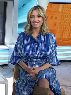 on Today on NBC was spotted wearing this blue plaid shirtdress on Today on Sep 06 2023's episode. 's Dress is the Kate Geometric Long Sleeve Tiered Shirtdress by Sandro.