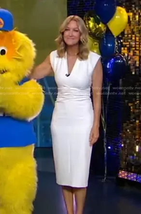 Lara Spencer on Good Morning America on ABC was spotted wearing this white ruched sheath dress on Good Morning America on Sep 07 2023's episode.