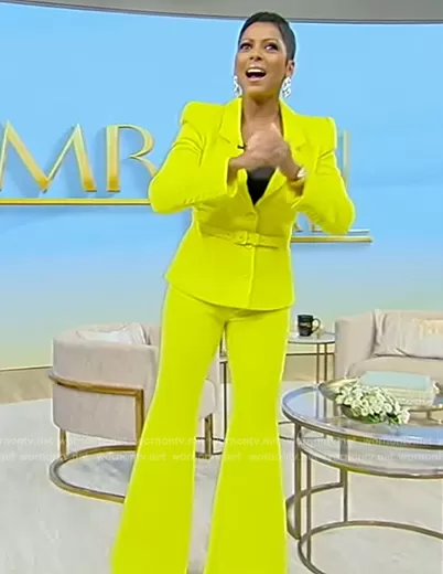 Tamron Hall on Tamron Hall Show on ABC was spotted wearing this yellow belted blazer and pants on Tamron Hall Show on Sep 07 2023's episode. Tamron's Blazer is the Belted neon wool-crepe blazer by Sergio Hudson . Tamron's Pants is the Neon wool-crepe flared pants by Sergio Hudson.