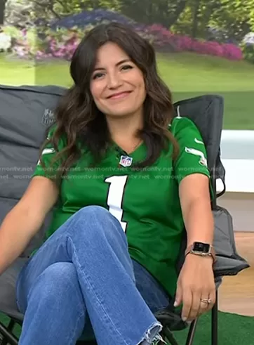 Adrianna Barrionuevo Brach on Today on NBC was spotted wearing this grey jersey tee on Today on Sep 07 2023's episode. Adrianna's Top is the Jalen Hurts Kelly Green Philadelphia Eagles Alternate Legend Player Jersey by Nike.