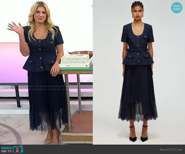 on Today on NBC was spotted wearing this navy scoop neck tweed jacket and tulle skirt on Today on Sep 07 2023's episode. 's Dress is the Navy Metallic Bouclé Tailored Midi Dress by Self Portrait.