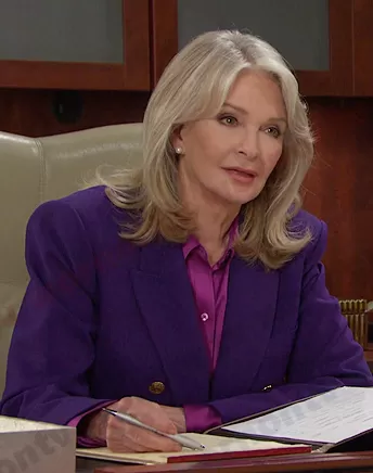 Marlena Evans (played by Deidre Hall) on Days of our Lives on Peacock was spotted wearing this purple blazer with gold buttons on Days of our Lives on Sep 08 2023's episode. Marlena's Jacket is the Tailored Blazer with Buttons by Zara.