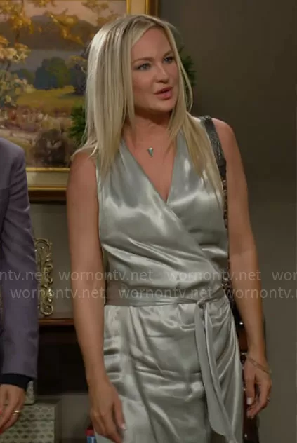 Sharon Newman (played by Sharon Case) on The Young and the Restless on CBS was spotted wearing this long green silky wrap dress on The Young and the Restless on Sep 08 2023's episode. Sharon's Dress is the Satin Wrap Dress in Glass by Vince.