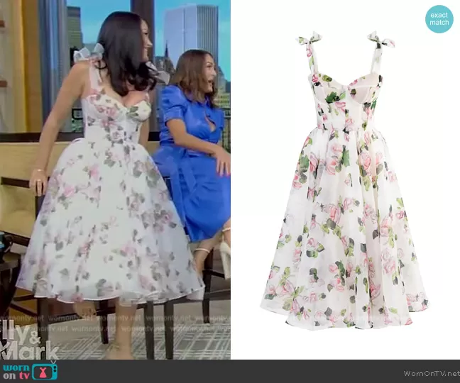 on Live with Kelly and Mark on Disney ABC Home Entertainment was spotted wearing this white floral print tulle dress on Live with Kelly and Mark on Sep 08 2023's episode. 's Dress is the Tender floral midi tie-strap dress by Milla.