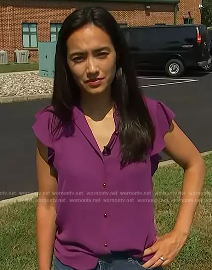 on NBC News Daily on NBC was spotted wearing this purple ruffle top on NBC News Daily on Sep 08 2023's episode. 's Top is the Ruffle Mock Neck Top by Calvin Klein.