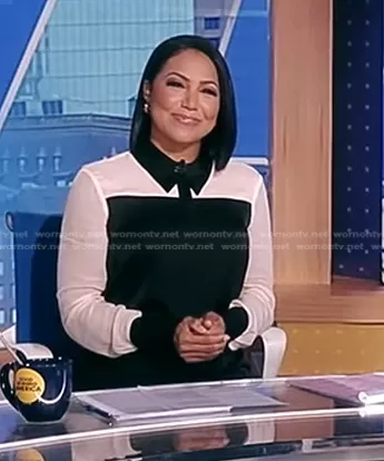 Stephanie Ramos on Good Morning America on ABC was spotted wearing this black colorblock blouse on Good Morning America on Sep 28 2023's episode. Stephanie's Top is the Lorey Silk Colorblock Shirt by Reiss.