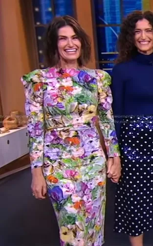 on Good Morning America on ABC was spotted wearing this floral dress on Good Morning America on Sep 11 2023's episode. 's Dress is the Floral Midi Dress by Monique Lhuillier .
