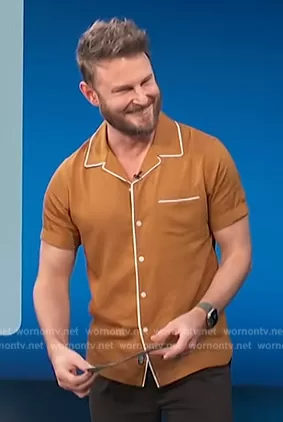 on Access Hollywood on NBC was spotted wearing this contrast tipped shirt on Access Hollywood on Sep 12 2023's episode. 's Shirt is the Rayon Lounge Shirt by Todd Snyder.