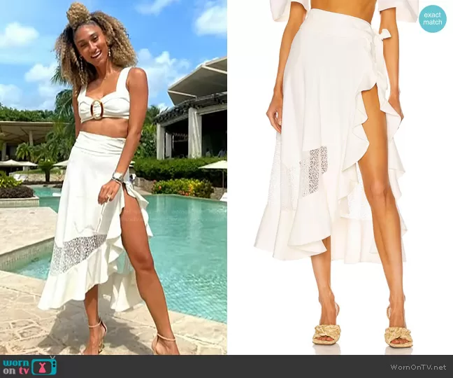 Ally Love on Today on NBC was spotted wearing this white bralette and wrap skirt on Today on Sep 12 2023's episode. Ally's Top is the Linen Bralette by PatBO . Ally's Skirt is the Linen Midi Wrap Skirt by PatBO.