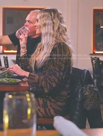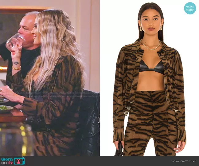 Whitney Rose on The Real Housewives of Salt Lake City on Bravo was spotted wearing this tiger print shirt and slit pants on The Real Housewives of Salt Lake City on episode 'Vacation Crashers' (4x02) in Sep 2023. Whitney's Top is the Cropped Oversized Boyfriend NK Shirt in Brown Tiger by Norma Kamali . Whitney's Pants is the Spat Legging in Brown Tiger by Norma Kamali . Whitney's Bag is the Leather Mini Bag by Fendi.