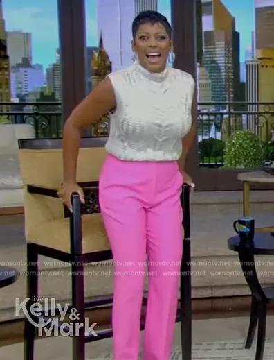 on Live with Kelly and Mark on Disney ABC Home Entertainment was spotted wearing this metallic cable knit sweater and pants on Live with Kelly and Mark on Sep 14 2023's episode. 's Vest is the Metallic Cable Knit Vest by Zara . 's Pants is the High Waist Straight Leg Sartorial Wool Cigarette Pants by Alexander McQueen.