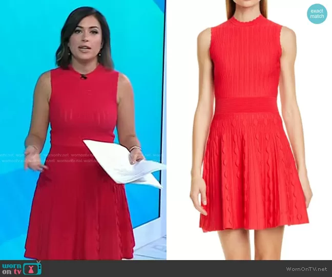 Chloe Melas on Today on NBC was spotted wearing this red scalloped knit dress on Today on Sep 14 2023's episode. Chloe's Dress is the Kamylia Scallop Knit Skater Dress by Ted Baker.
