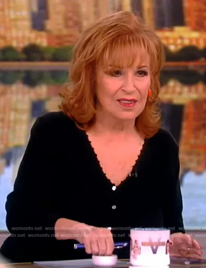 Joy Behar on The View on ABC was spotted wearing this black crochet trim cardigan on The View on May 15 2024's episode. Joy's Sweater is the Crochet-Trim Linen-Blend Cardigan by Vince.