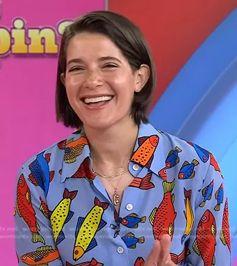 on Today on NBC was spotted wearing this fish print shirt on Today on Sep 14 2023's episode. 's Top is the Star Island Blouse in Blue Corsican Trout by LHD.