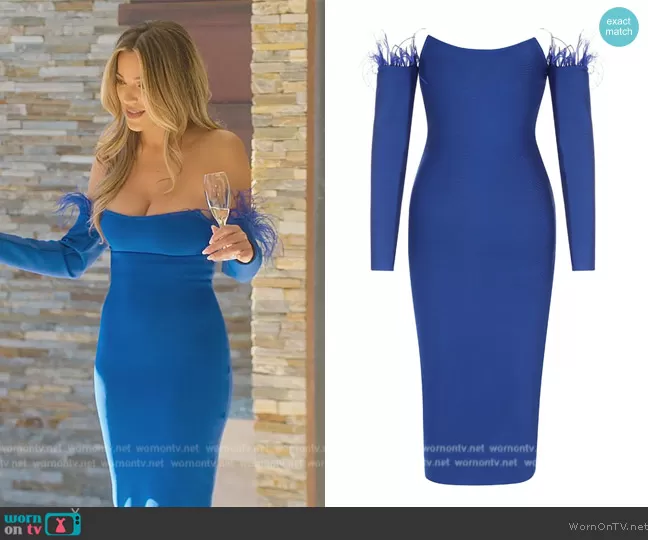 Alex Halll (played by Alex Hall) on Selling the OC on Netflix was spotted wearing this blue feather trim off shoulder dress on Selling the OC on episode 'The Elephant in the Office' (2x02) in Sep 2023. Alex's Dress is the Off Shoulder Feather Dress by Bella Barnett.