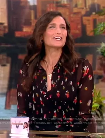 on The View on ABC was spotted wearing this black floral print blouse on The View on Sep 14 2023's episode. 's Top is the The Mellie Top by Hill House Home.