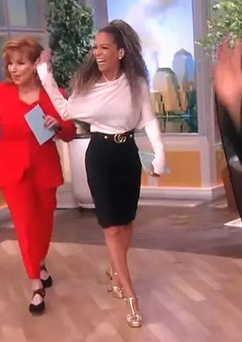 Sunny Hostin on The View on ABC was spotted wearing this GG skirt and off shoulder top on The View on Sep 15 2023's episode. Sunny's Sweater is the Off-the-shoulder sweater by Tom Ford . Sunny's Skirt is the GG knee-length skirt by Gucci.