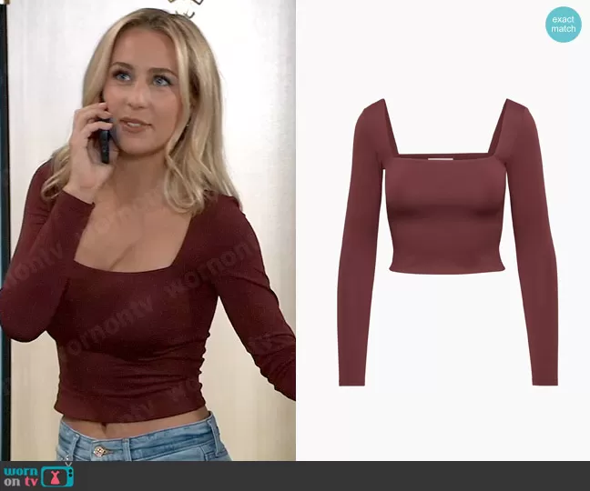 Josslyn Jacks (played by Eden McCoy) on General Hospital on ABC was spotted wearing this burgundy square neck top on General Hospital on Oct 06 2025's episode. Josslyn's Top is the Contour Squareneck Longsleeve in Spiced Burgundy by Babaton at Aritzia.
