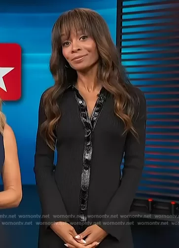 Zuri Hall on Access Hollywood on NBC was spotted wearing this black leather trim shirtdress on Access Hollywood on Sep 15 2023's episode. Zuri's Dress is the Shirt dress cardigan by Patrizia Pepe.