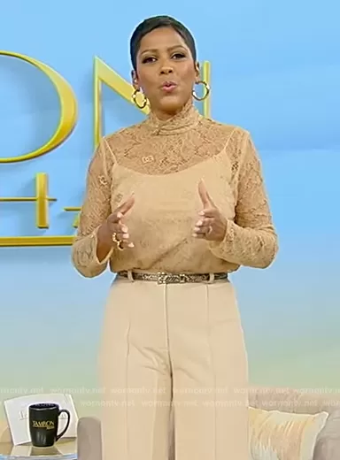 Tamron Hall on Tamron Hall Show on ABC was spotted wearing this beige lace turtleneck top on Tamron Hall Show on Sep 18 2023's episode. Tamron's Top is the Logo Lace Turtleneck Top by Dolce & Gabbana.