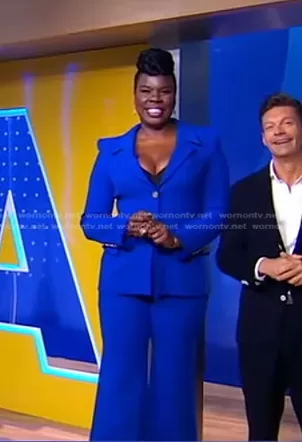 on Good Morning America on ABC was spotted wearing this blue pant suit on Good Morning America on Sep 18 2023's episode. 's Jacket is the Single-Breasted Wool Jacket in Cobalt by Sergio Hudson . 's Pants is the Flared Wool Crepe Trousers in Cobalt by Sergio Hudson.