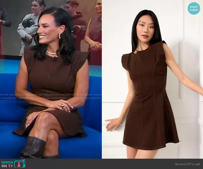 on Good Morning America on ABC was spotted wearing this brown mini dress on Good Morning America on Sep 18 2023's episode. 's Dress is the Napa Dress by R. G. Kane . 's Shoes is the Rosela Boot by D'Amelio Footwear.