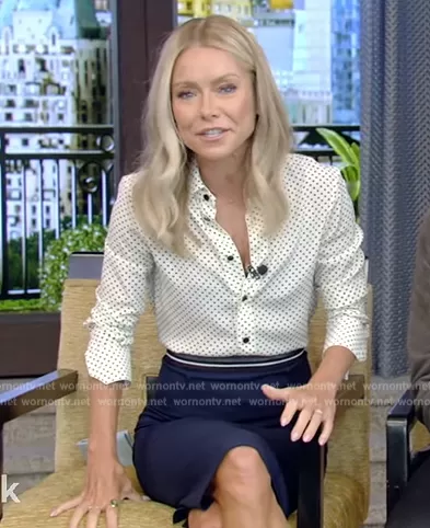 Kelly Ripa on Live with Kelly and Mark on Disney ABC Home Entertainment was spotted wearing this white polka dot print blouse on Live with Kelly and Mark on Sep 18 2023's episode. Kelly's Top is the Classic Shirt In Dotted Crepe De Chine by Saint Laurent . Kelly's Skirt is the Arreton Skirt by Roland Mouret.