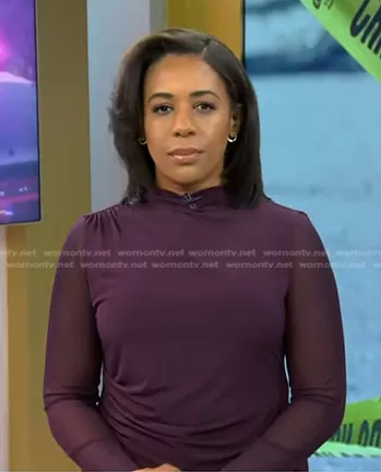 on Today on NBC was spotted wearing this purple mesh long sleeve top on Today on Sep 18 2023's episode. 's Top is the Drape Mesh Top in Aubergine by Calvin Klein.