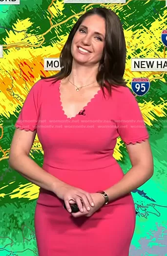 Maria Larosa on Today on NBC was spotted wearing this pink scalloped trim dress on Today on Feb 08 2024's episode. Maria L's Dress is the Short Sleeve Midi Sheath Dress by Maggy London.