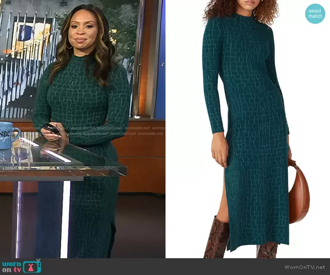 Adelle Caballero on Today on NBC was spotted wearing this green printed mock neck dress on Today on Sep 18 2023's episode. Adelle's Dress is the Neville Dress by Staud.