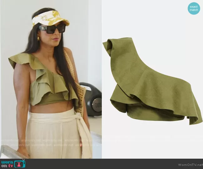 Jessel Taank on The Real Housewives of New York City on Bravo was spotted wearing this green one shoulder ruffle top on The Real Housewives of New York City on episode 'The Case of the Missing Phone' (14x11) in Sep 2023. Jessel's Top is the De Mar a Mar linen crop top by Johanna Ortiz.