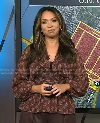 Adelle Caballero on Today on NBC was spotted wearing this brown printed wrap blouse on Today on Sep 19 2023's episode. Adelle's Top is the Tied Printed Wrap Blouse with Bow by Zara.