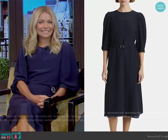 Kelly Ripa on Live with Kelly and Mark on Disney ABC Home Entertainment was spotted wearing this navy belted dress on Live with Kelly and Mark on Dec 04 2025's episode. Kelly's Dress is the Belted Elbow-Length Crepe Midi Dress by Chloe.