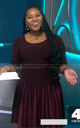 Kay Angrum on NBC News Daily on NBC was spotted wearing this burgundy lurex pleated dress on NBC News Daily on Sep 20 2023's episode. Kay's Dress is the Lurex Pleated Dress by Milly.