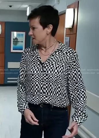 on NBC News Daily on NBC was spotted wearing this checkered blouse on NBC News on Sep 20 2023's episode. 's Top is the Contorted Check Silk Blouse by Elie Tahari.