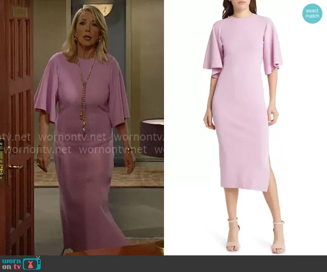 Nikki Reed Newman (played by Melody Thomas-Scott) on The Young and the Restless on CBS was spotted wearing this pink midi dress on The Young and the Restless on Sep 21 2023's episode. Nikki's Dress is the Lounia Dress in Lilac by Ted Baker . Nikki's Bag is the Bella Croco 12" in Light Grey by Teddy Blake.