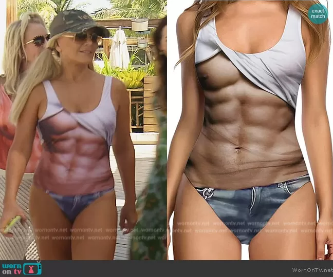Tamra Judge on The Real Housewives of Orange County on Bravo was spotted wearing this novelty muscle swimsuit on The Real Housewives of Orange County on episode 'Viva La Tres Amigas' (17x14) in Sep 2023. Tamra's Swimsuit is the Novelty Swimsuit by DYGUYTH.