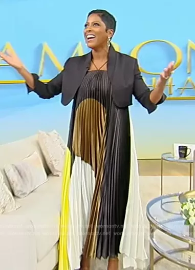 Tamron Hall on Tamron Hall Show on ABC was spotted wearing this pleated colorblock dress on Tamron Hall Show on Sep 21 2023's episode. Tamron's Dress is the Convertible Pleated Midi Dress by Delfi Collective.