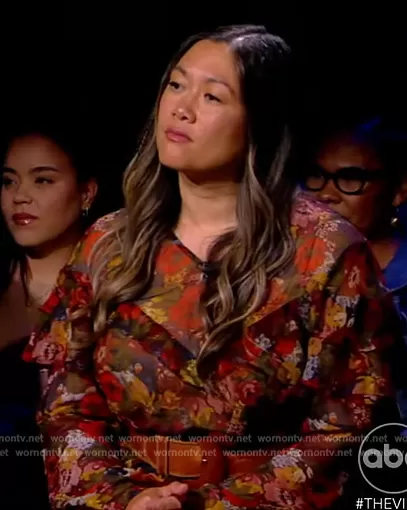 on The View on ABC was spotted wearing this red floral ruffle dress on The View on Sep 21 2023's episode. 's Dress is the Alouette Asymmetric Ruffled Floral-print Midi Dress by Doen.