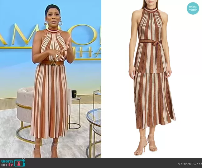 Tamron Hall on Tamron Hall Show on ABC was spotted wearing this metallic stripe halter top and skirt on Tamron Hall Show on Sep 22 2023's episode. Tamron's Dress is the Luminosity Metallic Knit Halter Top by Zimmermann . Tamron's Skirt is the Luminosity Striped Lurex Midi Skirt by Zimmermann.