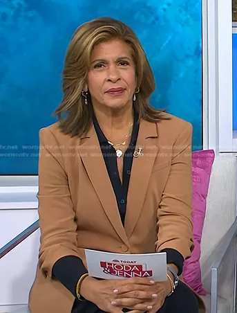Hoda Kotb on Today on NBC was spotted wearing this brown ruched sleeve blazer on Today on Oct 13 2023's episode. Hoda's Jacket is the Khloe Ruched Sleeve Blazer in Cinnamon by Cinq a Sept.