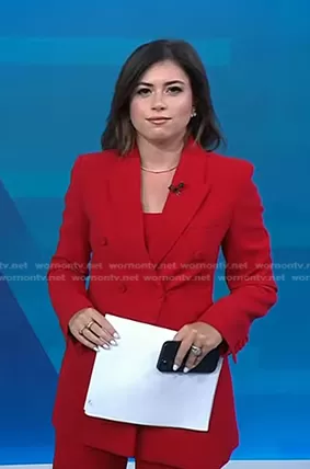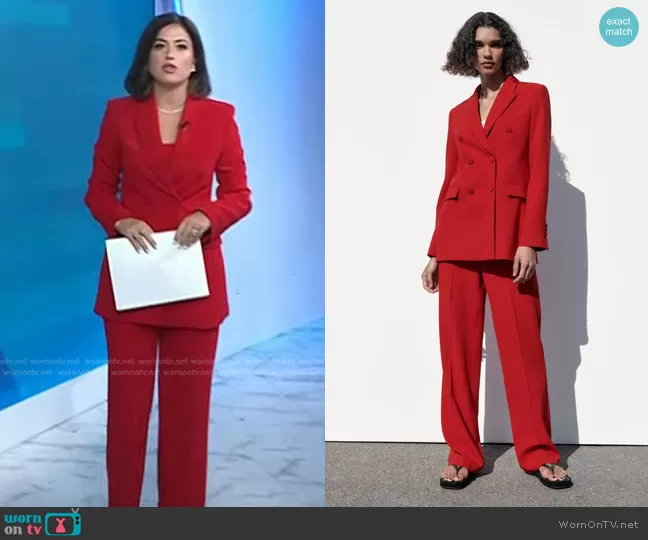 Chloe Melas on Today on NBC was spotted wearing this red blazer and pants on Today on Sep 22 2023's episode. Chloe's Jacket is the Double Breasted Blazer by Zara . Chloe's Pants is the Straight Trousers by Zara.