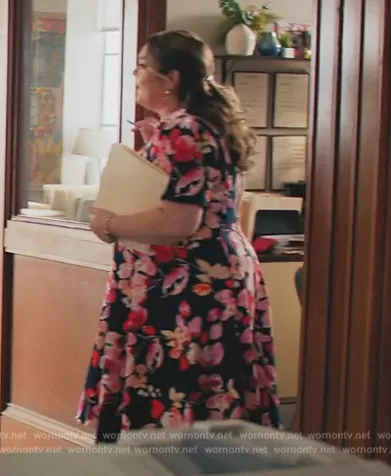 (played by Rebecca Field) on All Rise on OWN was spotted wearing this floral print flare dress on All Rise on episode 'Guilt Is a Bully' (3x12) in Sep 2023. 's Dress is the Scuba Crepe Sheath Dress by Calvin Klein.