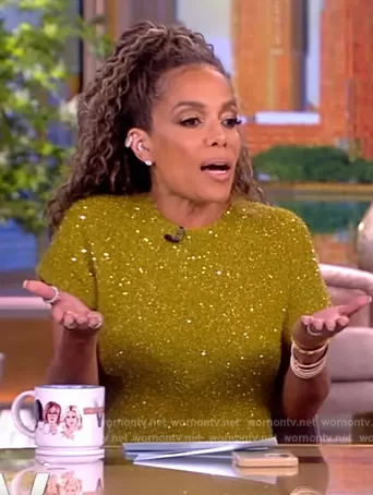 Sunny Hostin on The View on ABC was spotted wearing this green metallic dress with slits on The View on Sep 25 2023's episode. Sunny's Dress is the Technical Sequin Maxi Dress by Proenza Schouler.