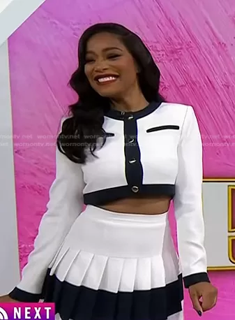 on Today on NBC was spotted wearing this white cropped jacket and pleated mini skirt on Today on Sep 25 2023's episode. 's Jacket is the Crepe Cropped Jacket by Sergio Hudson . 's Skirt is the Pleated Crepe Mini Tennis Skirt by Sergio Hudson . 's Shoes is the Hot Chick 100 Patent Leather Pumps in Bianco by Christian Louboutin.