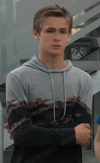 Jake Spencer (played by Hudson West) on General Hospital on ABC was spotted wearing this grey and black hoodie on General Hospital on Sep 25 2023's episode. 's Sweatshirt is the Tiger Camo Hoodie by American Rag .