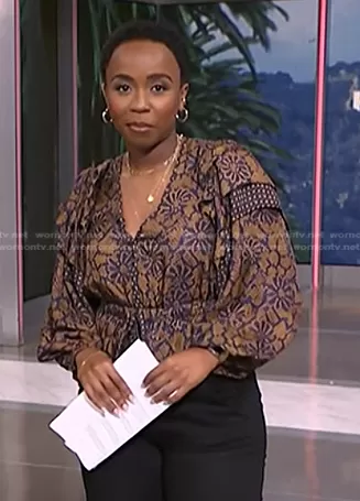 Zinhle Essamuah on NBC News Daily on NBC was spotted wearing this brown floral blouse on NBC News Daily on Sep 25 2023's episode. Zinhle's Top is the Hemlock Indra Blouse by Ulla Johnson.