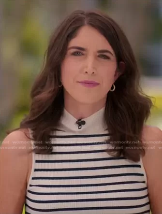 on NBC News Daily on NBC was spotted wearing this white striped mock neck sleeveless top on NBC News Daily on Sep 25 2023's episode. 's Top is the Sleeveless Mock Neck Ribbed Top in Black/White Striped by & Other Stories.