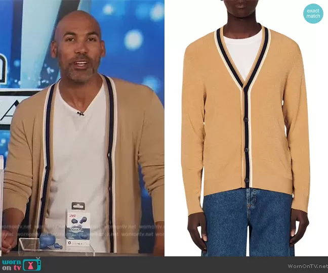 on Extra on Extra was spotted wearing this beige contrast stripe cardigan on Extra on Sep 24 2023's episode. 's Sweater is the Milo Tipped Cardigan by Sandro.